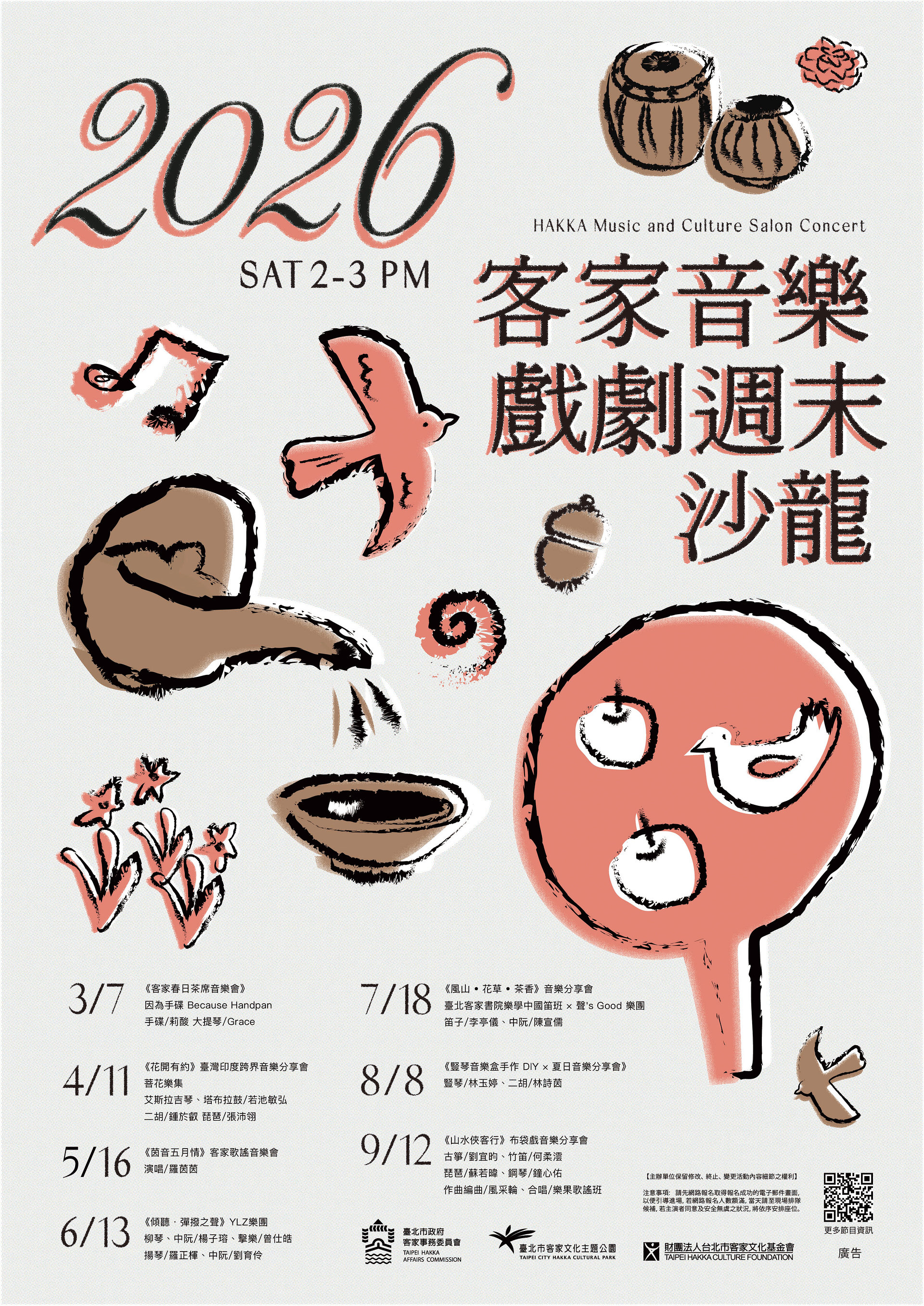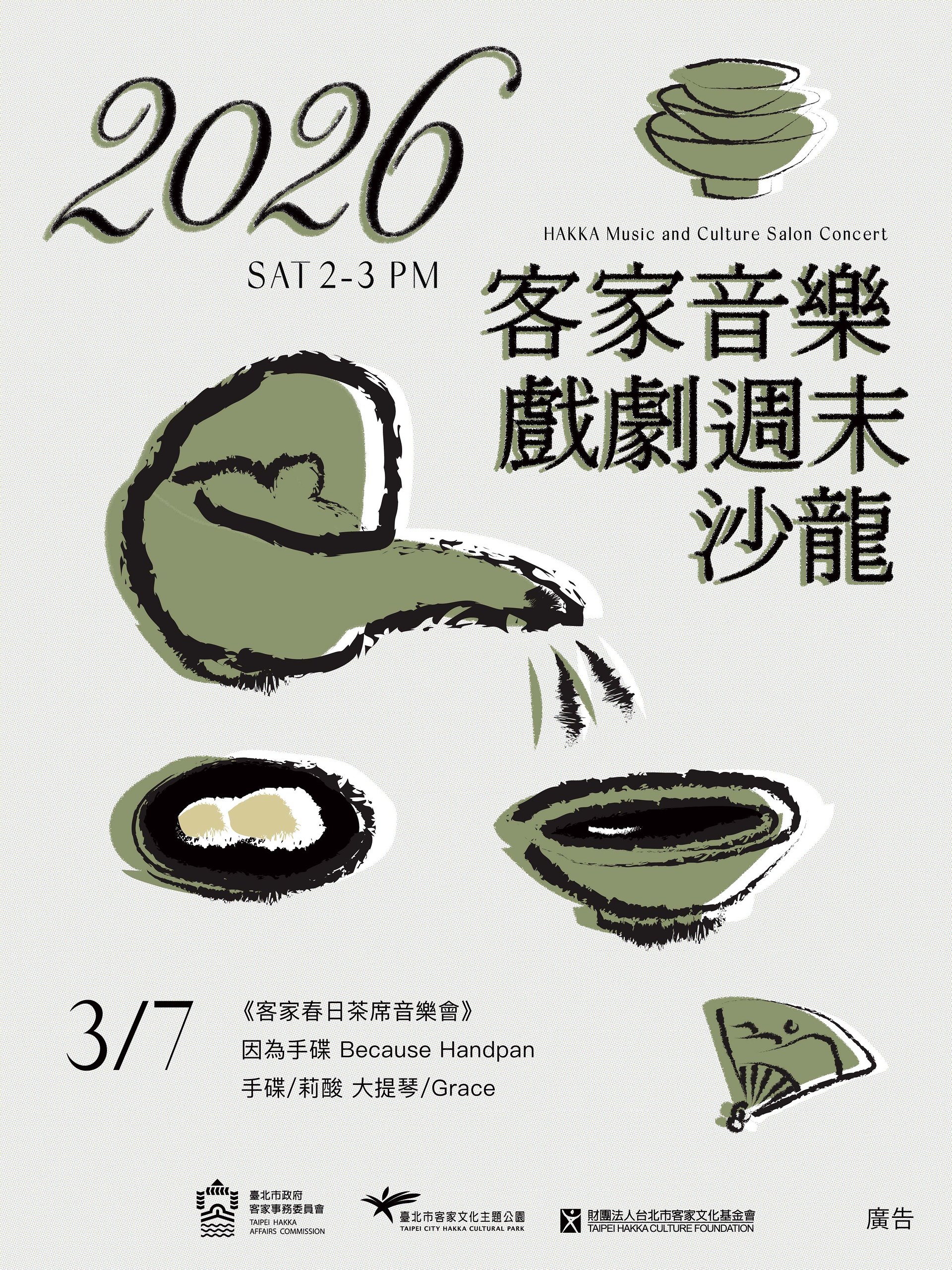 「客家音樂戲劇週末沙龍」將於 3 月至 9 月期間盛大舉行,規劃七場主題演出,匯聚多位表演藝術工作者,透過音樂交織詩詞吟唱,並融入奉茶與下午茶文化,營造兼具人文底蘊與悠閒氛圍的假日藝文空間,邀請市民朋友一同走進客家表演藝術的細膩世界。