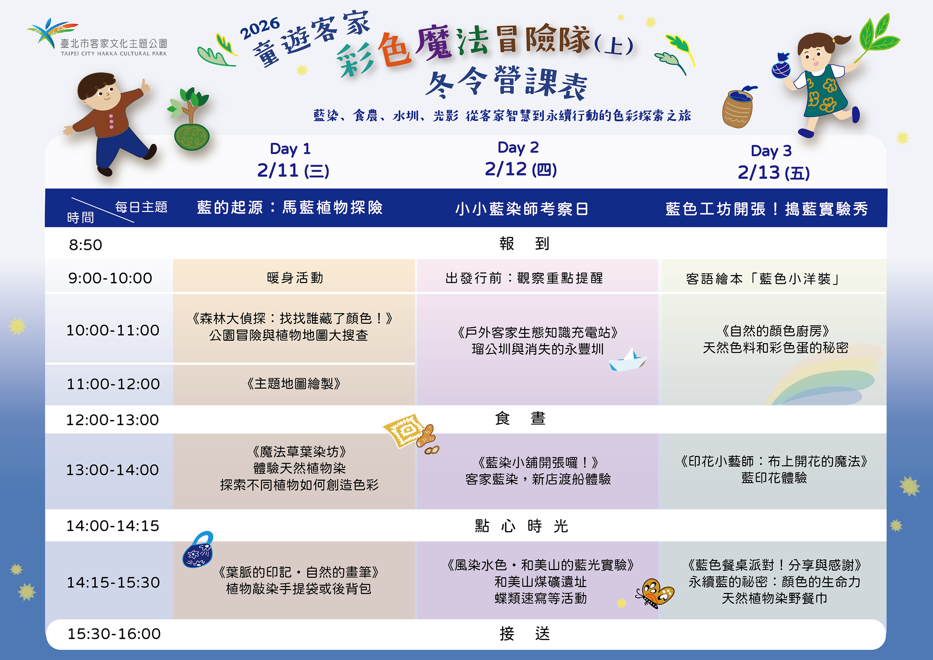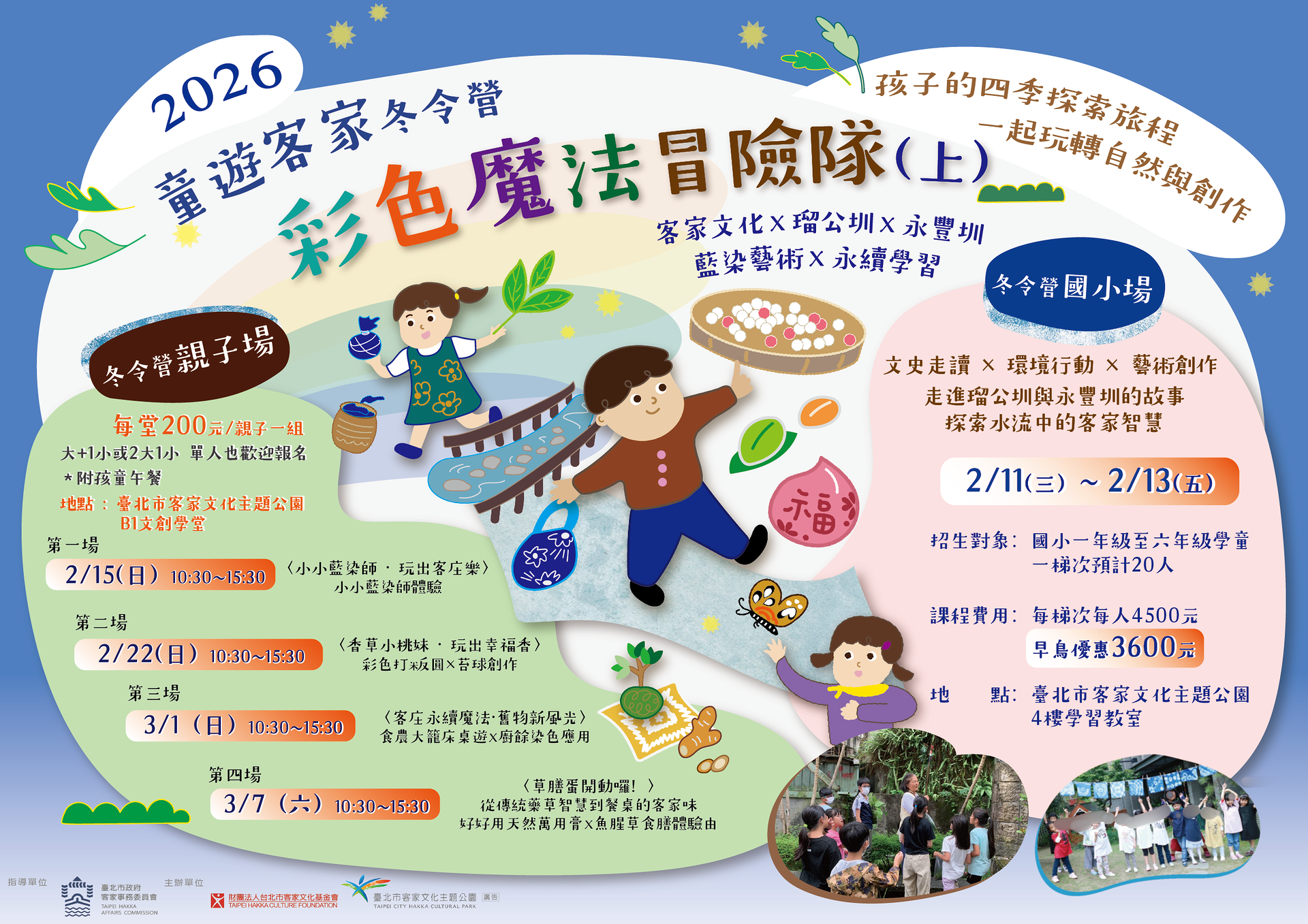 今年度童遊客家以「水」與「色」、「環境」為主軸,透過藍染、食農與環境觀察,帶領孩子理解客家族群如何運用自然的力量,轉化為生活美學與生態智慧,進而培養他們對土地與文化的情感連結!