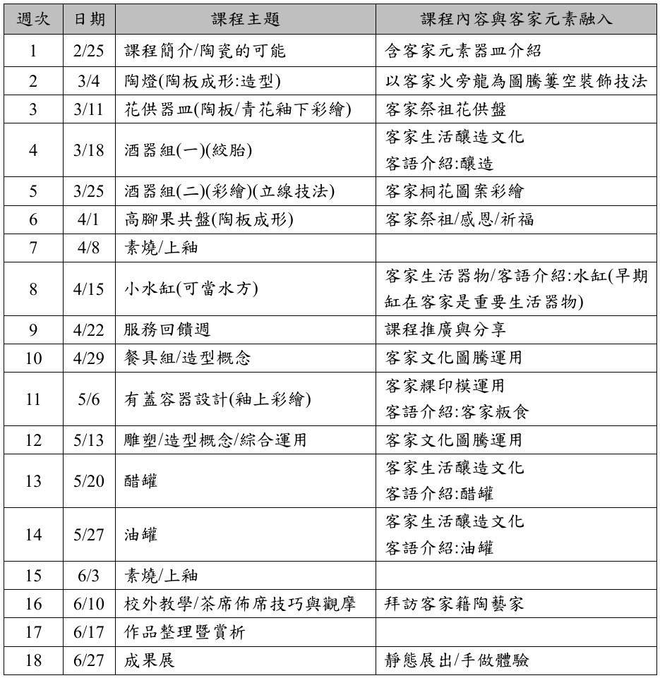 配合客家節慶活動及客家文化底蘊為依據後創意發想,以生活四藝五感讓學員完成具個人特色的創作品,讓客家生活陶瓷器物變成是身心靈釋放的媒介。透過陶藝課程學習陶瓷器皿的製作技法,將客家節慶活動與生活藝術美感融入作品中,這學期除了生活器物外,還融入客家文化的習俗圖騰為元素, 運用淺顯易懂的技法讓學員輕鬆動手做陶。以陶瓷媒材為創作呈現多元之樣貌,除了增進陶瓷技術與美感欣賞外.,並以自然為師增進觀察與創意發想的能力。且安排校外參訪客籍藝術家活動,讓更多人了解客家生活與陶瓷藝術文化達到互相了解與交流之目的。