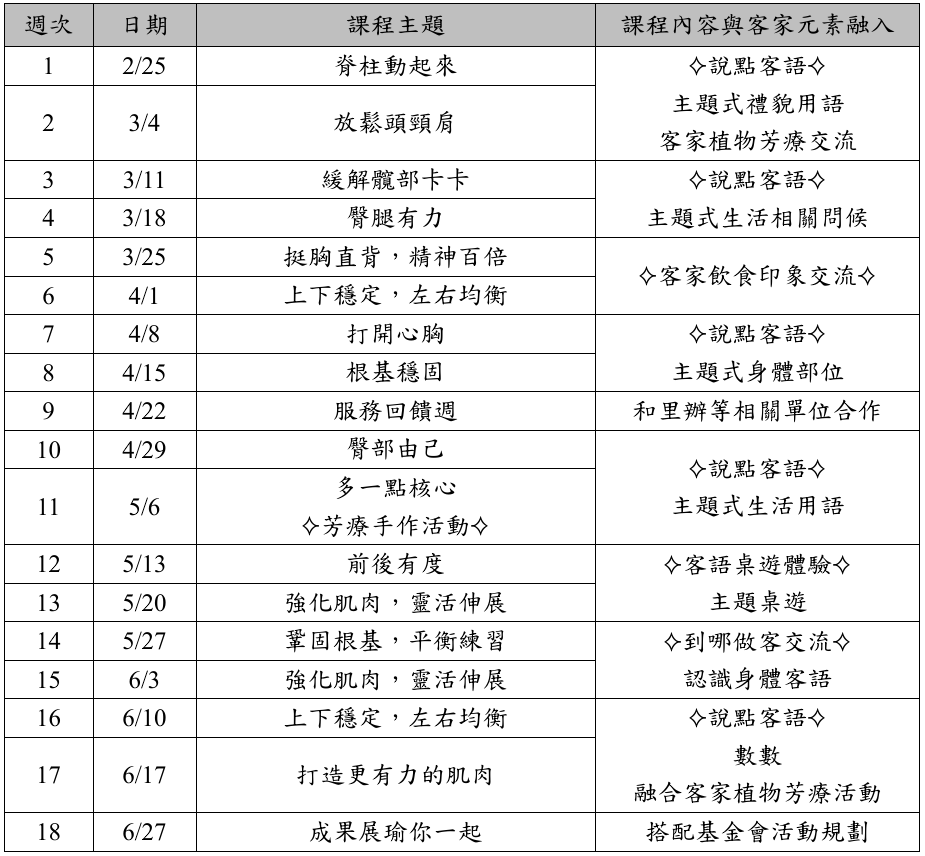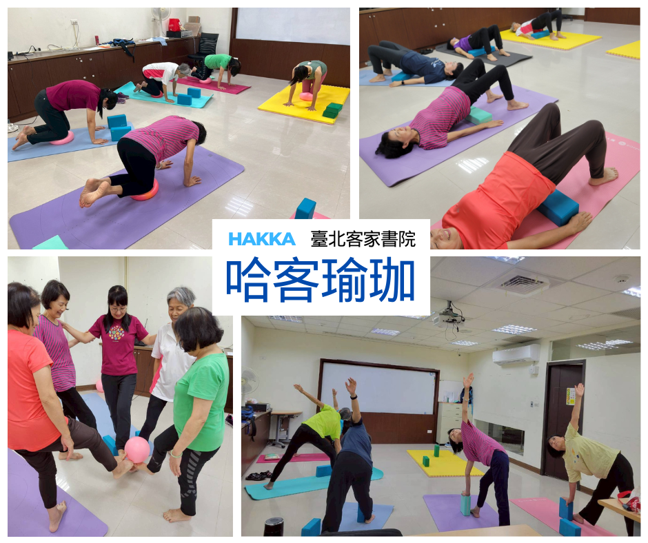 3. 除讓學員熟悉瑜珈入門基礎的身體練習外,適時結合遊戲或活動讓每堂課說一點客家話,或陸續揭開關於客家飲食、育樂旅遊等與日常相關的討論分享。