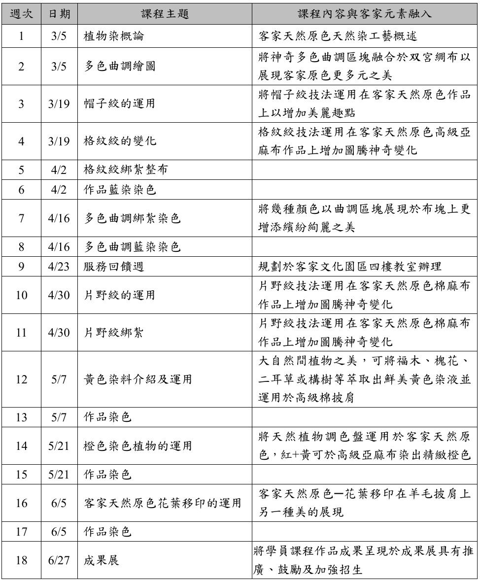 本課程同時考量環保及健康因子,教導學員採用傳統天然萃取染液染色。在課程間,將由學員經由學習客家天然原色融入生活經驗,將天然染色染製作品以生活化、故事化並轉換成可實用之服裝、包袋、掛畫等實品,一則使學員體會客家傳統儉樸精神,並可藉以提升個人、家庭健康的生活品質,期以達到提升客家精神之教化推廣。