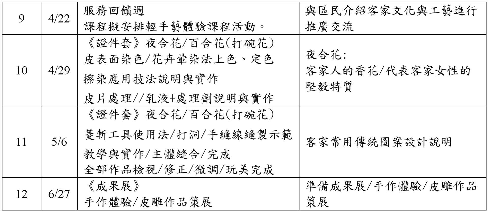 皮革職人精神的實踐,林老師從自學出發,長期觀察客庄原鄉人文特色,轉化為各式具有客家精神的創作,展現客家人純樸勤懇又重實用的風貌;皮革為生活和實用性相當高的作品,本課程以簡單的皮革創作融合客家文化意象如:端午節、桐花、染色技法...等帶入皮雕作品。