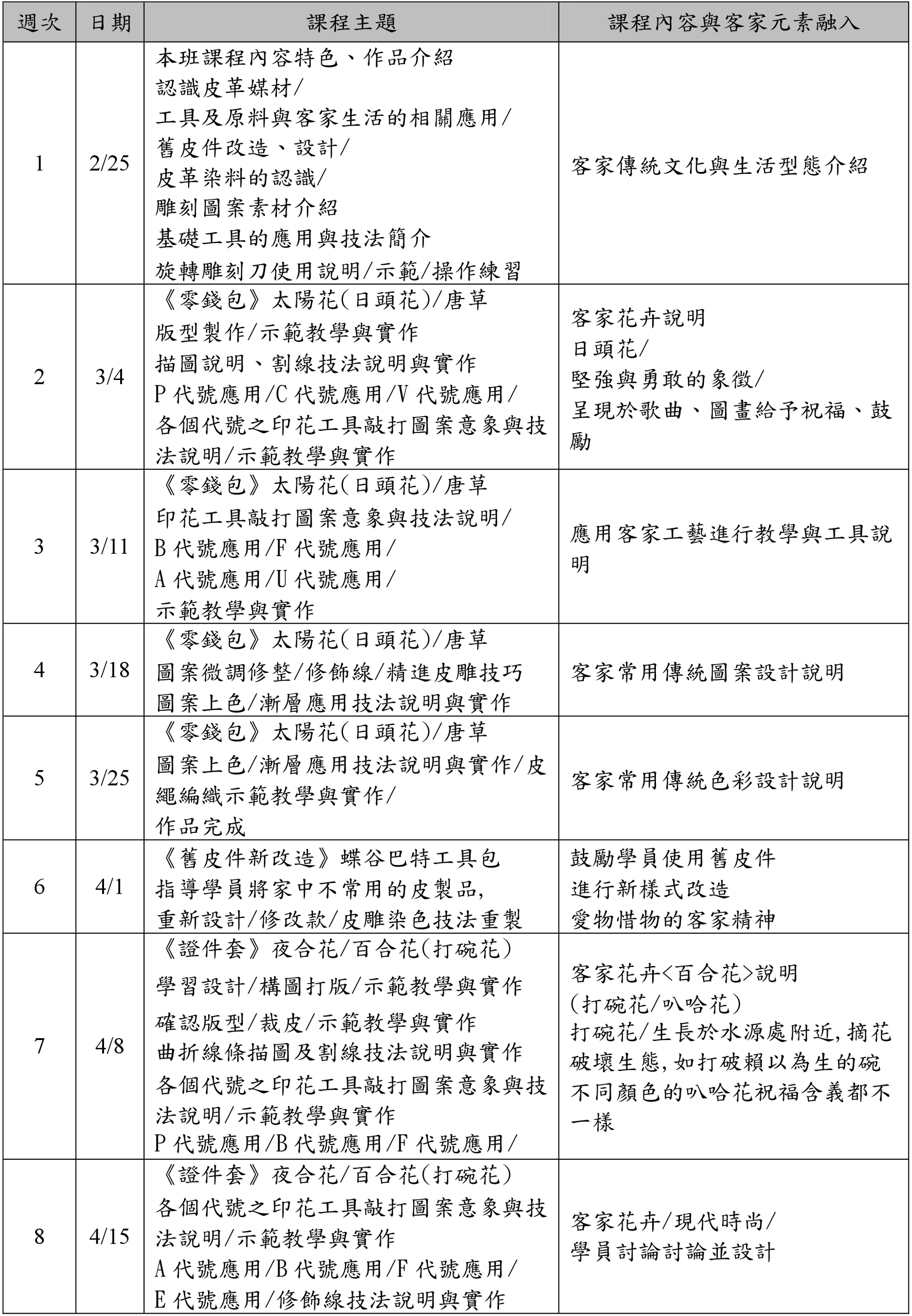 本班課程以花卉-唐草雕刻彩繪為主,融入客家文化多元風格且時尚之皮雕工藝的作品更具特色。