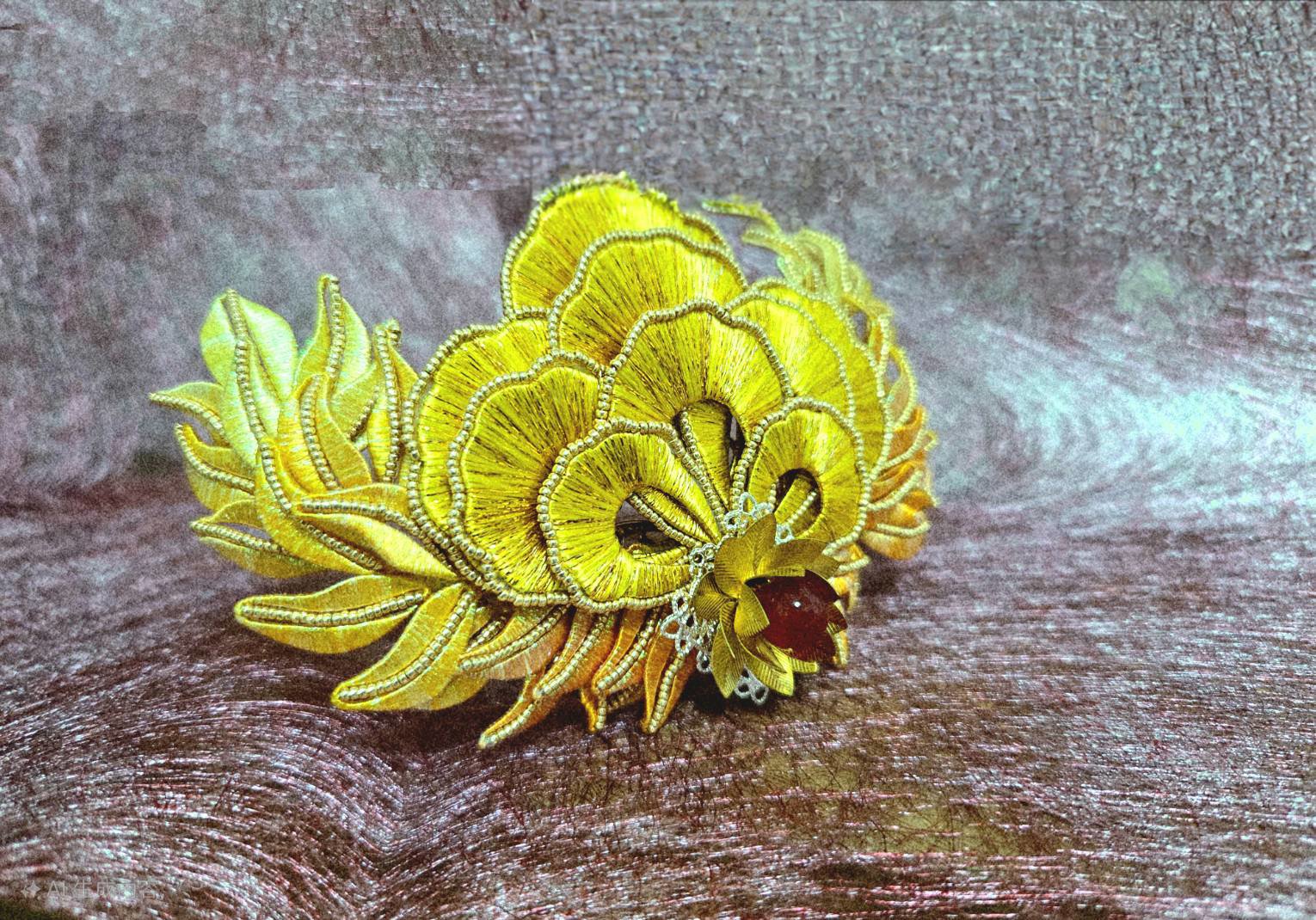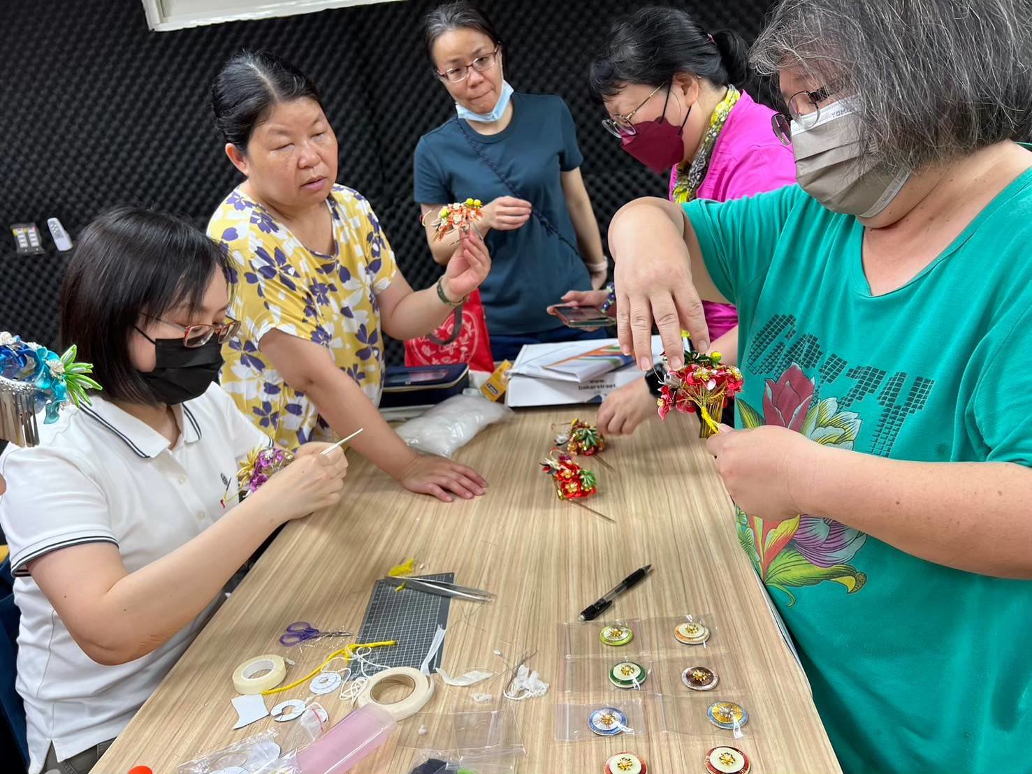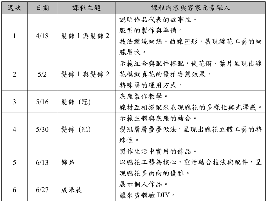 課程結合西方珠寶與神話六月花神故事的理念來延伸,呈現三至四個作品,飾品更以現代風格來展現。並在課堂中解說自製飾品底座、特殊髮簪的用法,讓學員體驗客家纏花新元素外,也能創作出獨一無二的屬於自己的作品。