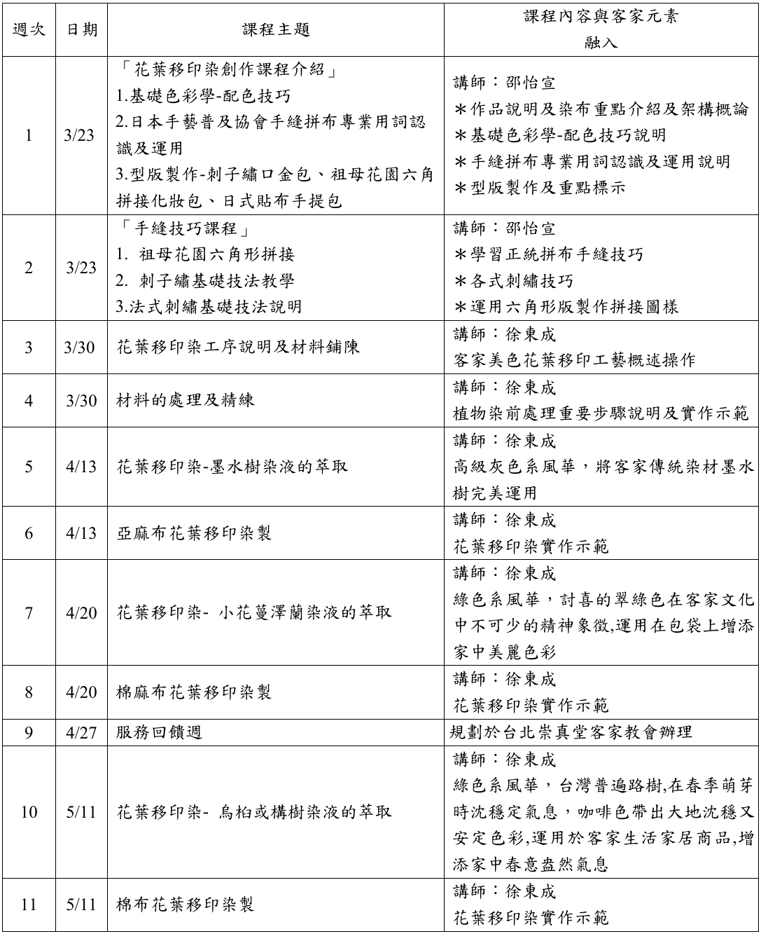 經由講師說明、演示、指導學員由基礎入門漸進學習,經由客家美色─花葉移印在進入精品創作境界。