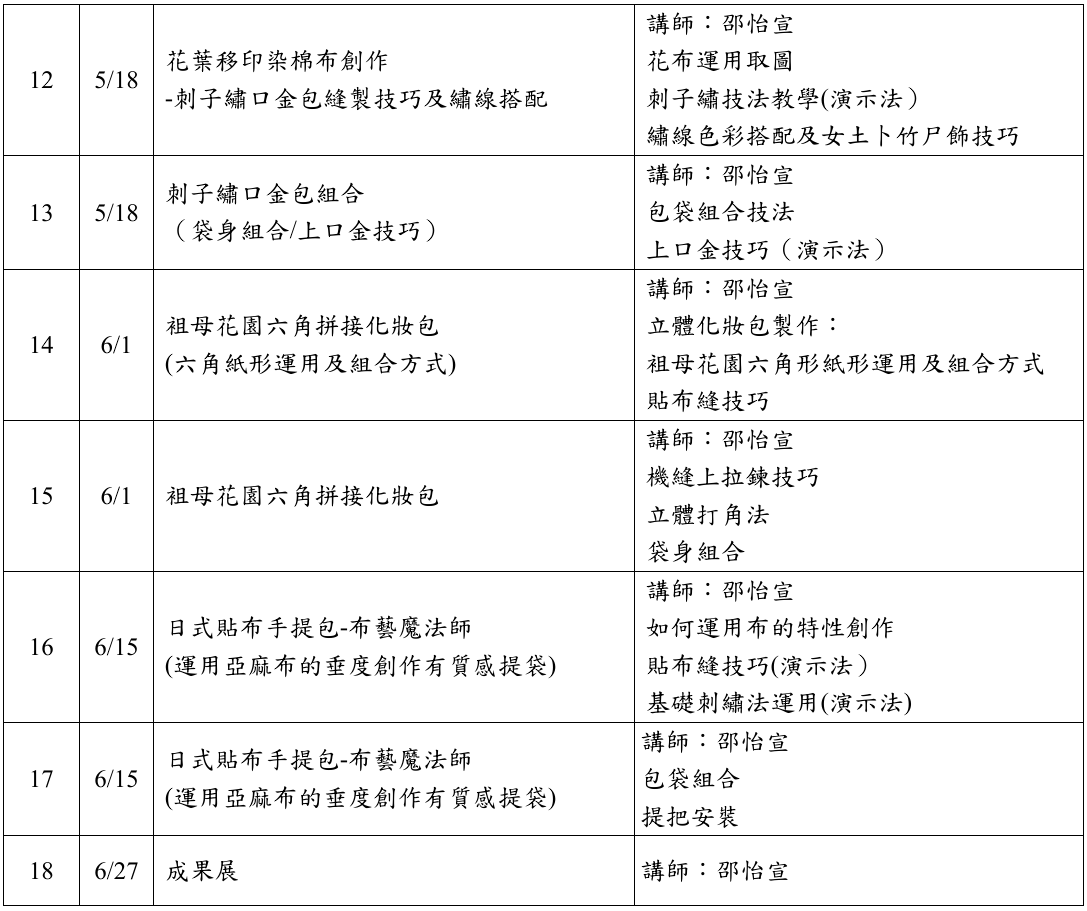 2.創作課中邵怡宣老師將透過「日本拼布手藝普及協會」指導員專業認證教學,使學員能將平面的布創作包袋,並能在細節上精進,新學員透過正統拼布手縫及機縫技巧輕鬆上手。