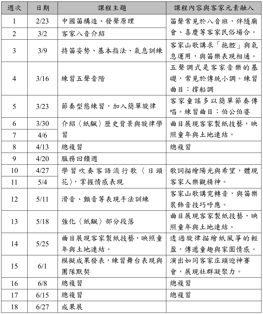 中國笛在客家文化中不僅是音樂表演的樂器,更承載了族群記憶與情感寄託。本學期課程以客家音樂為基礎,結合笛樂的吹奏技巧,引領學員體驗傳統旋律與文化內涵。重點曲目《紙颻》源自客家生活技藝,藉由音樂展現製紙與紙風箏的意象,象徵著童年回憶與土地連結。我們將從基礎指法到旋律演繹,帶領學員在演奏中感受客家人對自然與工藝的珍惜,讓文化在音符間鮮活重現,成為可學、可傳承的生活實踐。