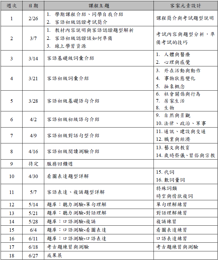 本課程主要教材以中央客委會客語能力認證教材來設計,融入客家文化及生活客語詞彙介紹、客語情境對話練習、幫助學習客家的食、衣、住、行、愈、樂。
