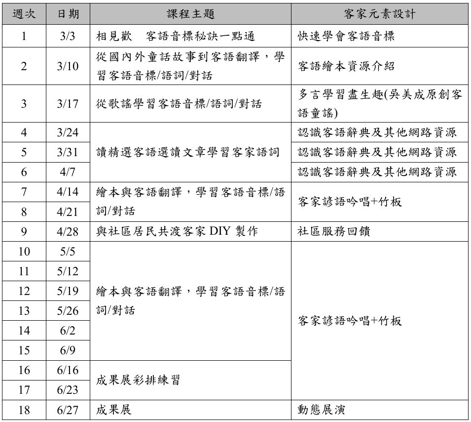 透過精選客語朗讀文章, 以讀書會形式學習客家語網路資源, 認識客語語詞、 諺語、 師傅話...,朝客語認證進階到高級通過為目標。 以講師翻譯的<小王子>繪本客語版故事,及國外優選受學童喜愛的繪本,例如:魔法糖果、發光的樹、 章魚先生買褲子 、 活成自己的光、 嘉明湖、 小狗阿疤想變羊、 小刺蝟的旅程-我與你相遇、朱家故事…等多本國際知名繪本,在欣賞國際及優良繪本的同時, 聆聽有趣的繪本故事,思考做人處事道理,增進人格成長教育, 進而學習客語聽說讀寫唱,加上竹板練習,輕鬆學客語,更愛客家的說學逗唱。在課程中有輕鬆對話及文章閱讀,學到客家文化、諺語等相關知識、 提升客語教學知能為目標。