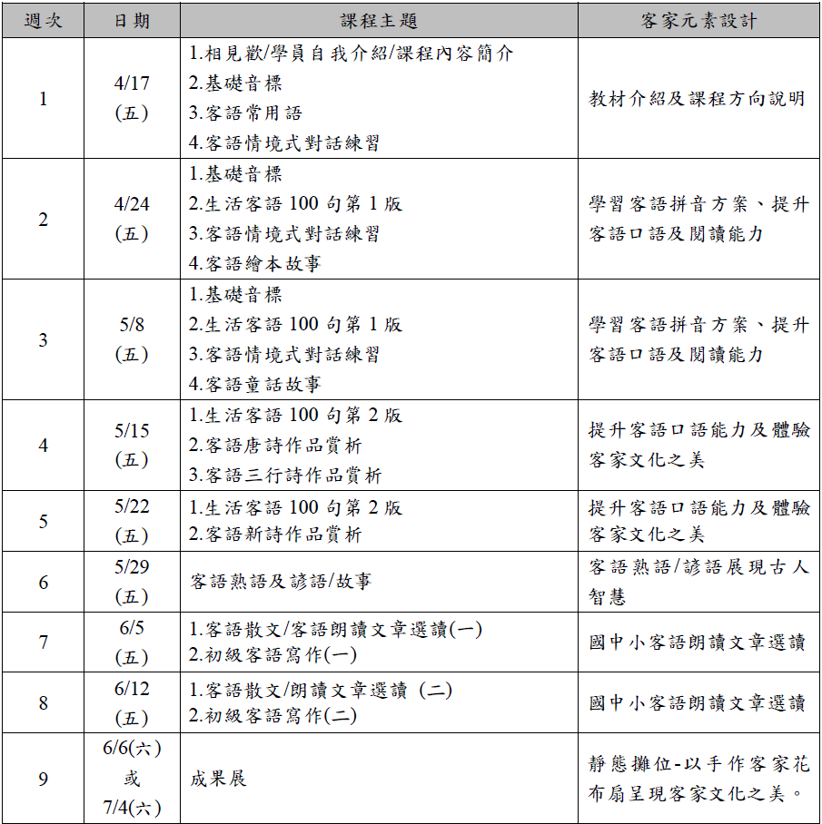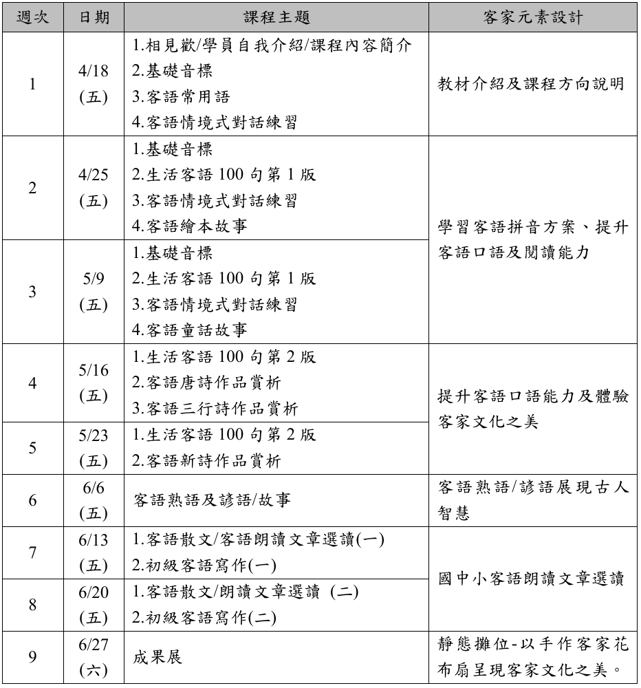 本課程主要以推廣生活客語、提升生活中客語使用率為目標,並以客語唐詩、客語三行詩及新詩,來充分展現客語文之美;並加入客語繪本及童話故事、老古人言、客語熟語及諺語等,讓學員不但能帶著輕鬆愉快的心情來參與課程,也可以有效率的習得老祖宗的智慧,進而在客語傳承上往前邁進。