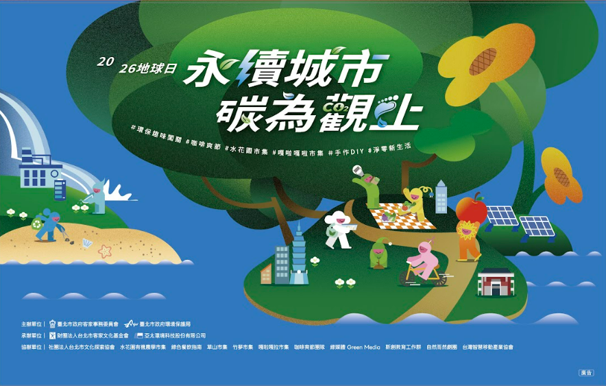 2026年的地球日主題為「永續城市‧碳為觀止」,由臺北市政府客家事務委員會、臺北市政府環境保護局跨局處合作,由財團法人台北市客家文化基金會,以及民間NPO、社會企業跨域結盟合作辦理「永續城市‧碳為觀止」園遊會,現場齊聚二手物資、青年手創、質感餐點、精品咖啡、電動車體驗及益智闖關等近百個攤位。在四月台北兒童月的溫馨氛圍中,誠摯邀請市民朋友老幼攜手透過這場別具意義的「零廢棄」同樂盛會,用如同孩子們的純粹心意守護共同的地球。