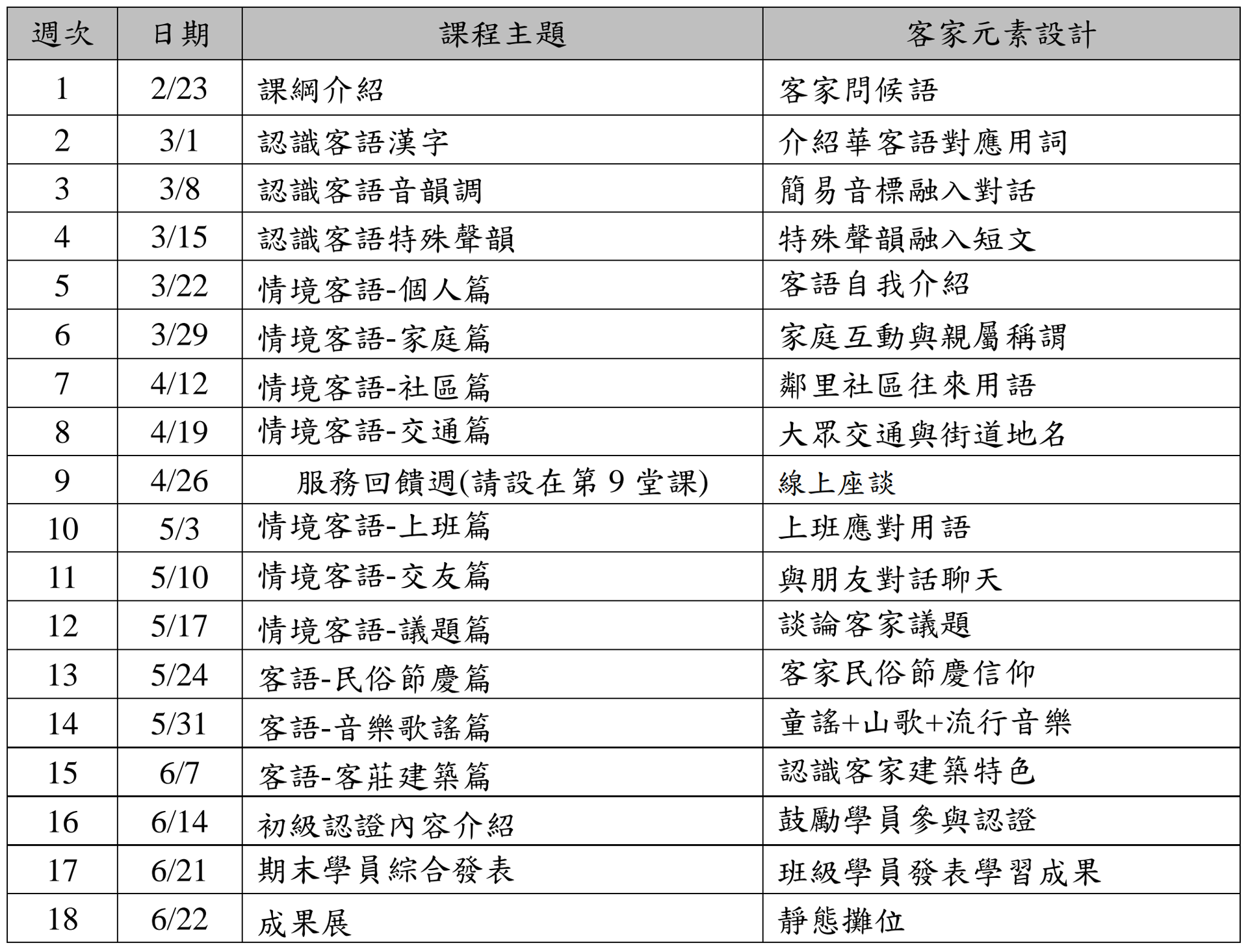 一、客家語文初階班的課程設計,主要元素為客家語文和客語情境對話。