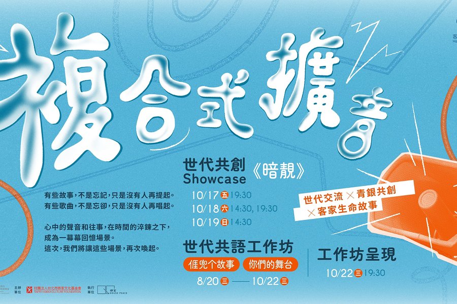 「客家藝展平台」計畫以臺北市客家音樂戲劇中心劇場為展演基地,鼓勵藝術團體結合客家文化展現多元的表演藝術。今年以「複合式擴音」為主題,除 Showcase 製作《暗靚》,亦規劃銀髮故事工作坊與青年工作坊,展現跨世代、多元的當代客家藝術能量。